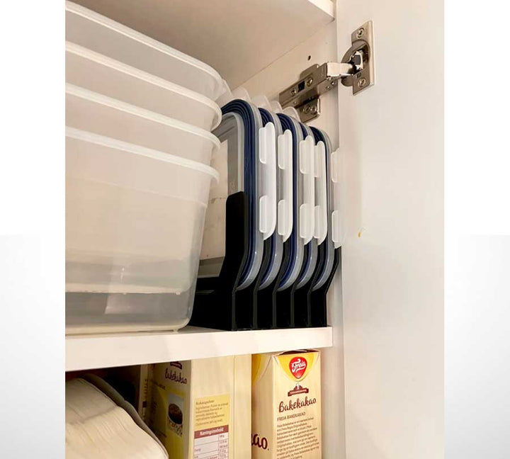 Hold orden i dine køkkenskuffer og -skabe med disse holdere til lågene til dine madopbevaringsbøtter fra Ikea 365+.
