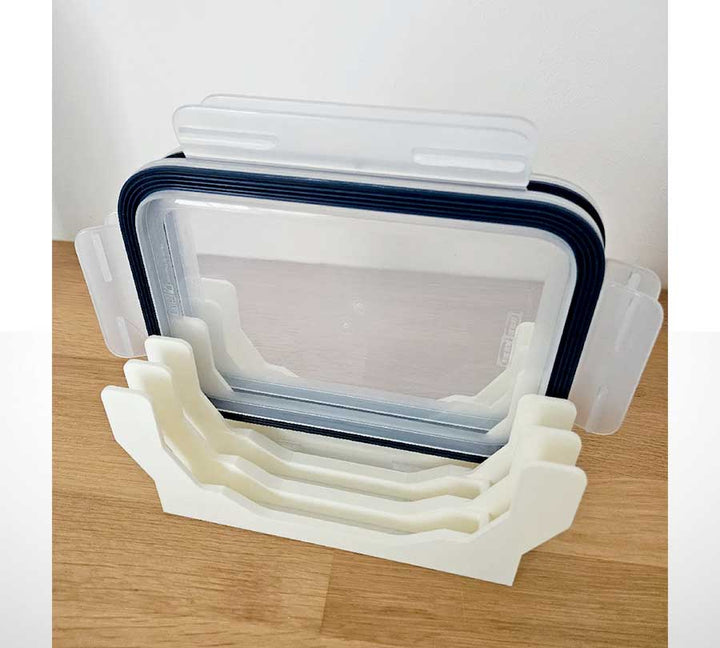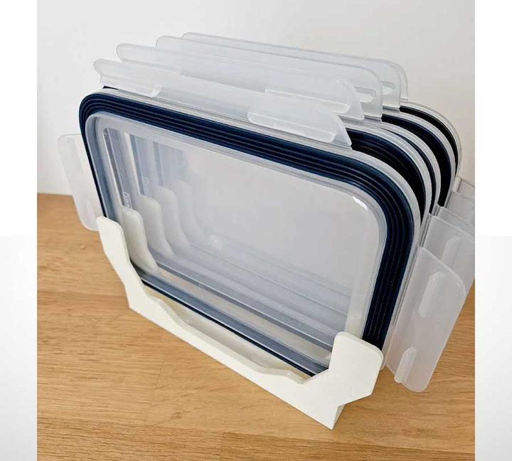 Holderen passer til de rektangulære plastiklåg og har plads til 5 stk.